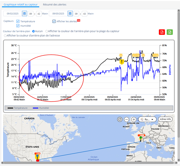 L'enregistreur humidité géolocalisé Go Real Time XL 4G-5G LT contrôle les variations d'humidité lors de vos trajets (jusqu'à 60 jours).